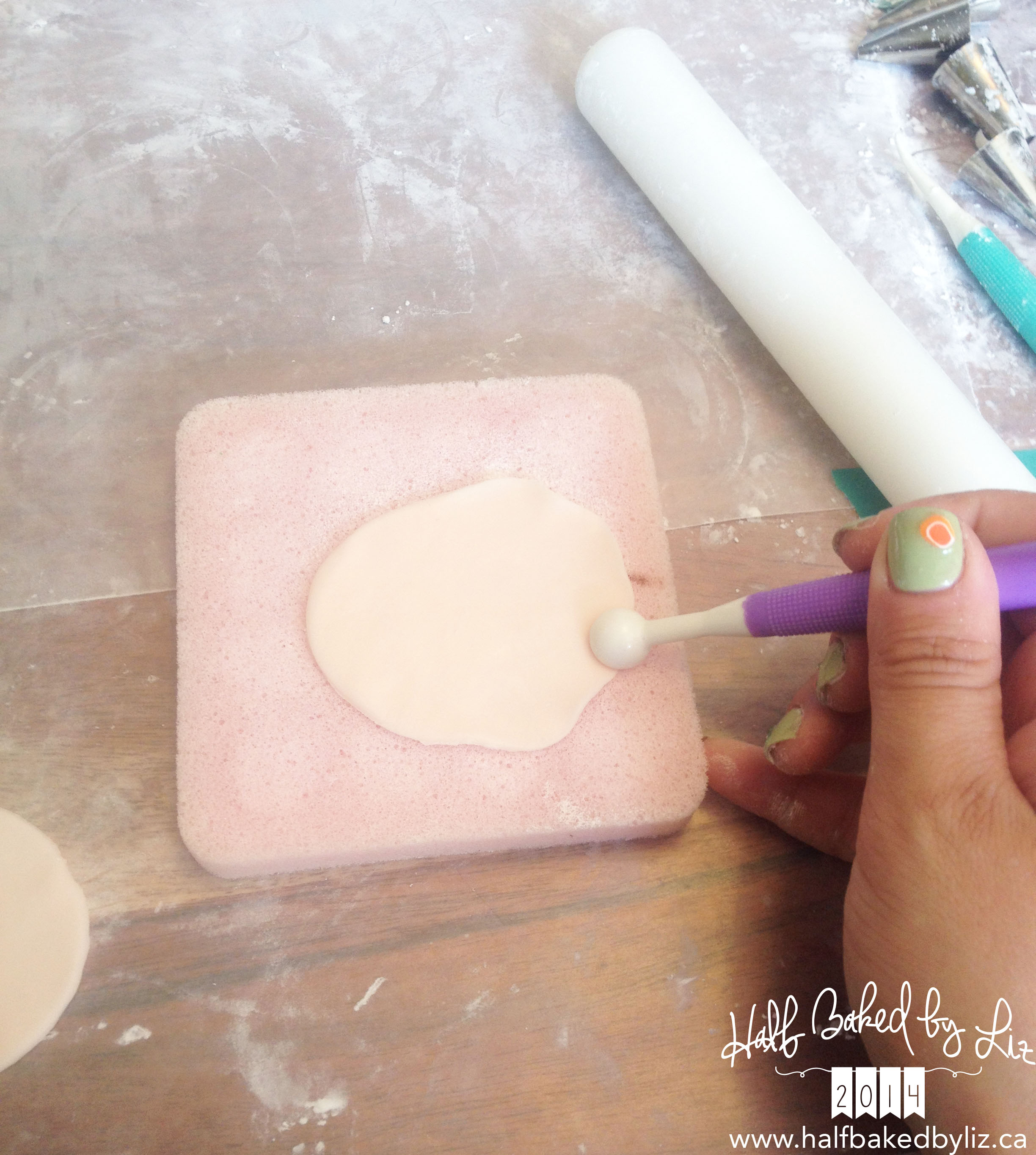 Then, thin out one side of each circle on a foam square with a ball-ended tool. If you don’t have one, you can just use your fingertips.